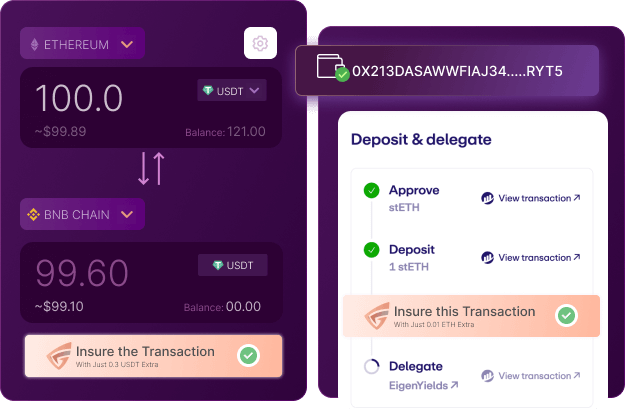 One-Click Transaction Insurance for all cross-chain transactions on Crypto Bridges. Crypto Bridges can enable end to end Insurance, without disrupting transaction flow.